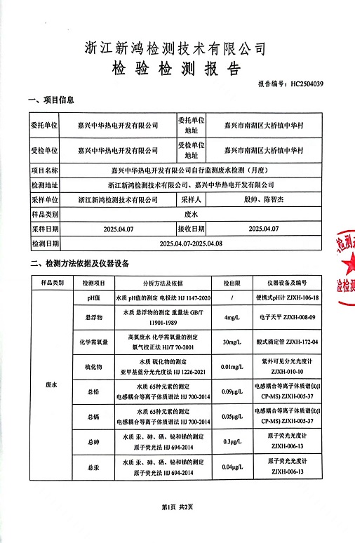 報(bào)告名稱:中華熱電4月廢水檢測(cè)報(bào)告